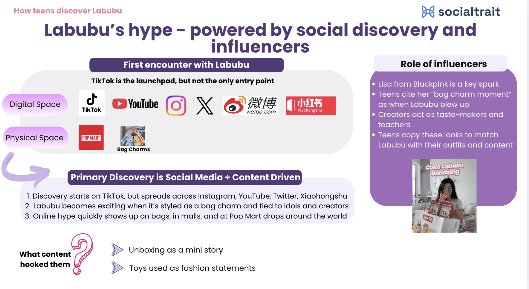 Influencer Spark: The “Liza effect” (Lisa from BLACKPINK) became a cultural permission signal when she used Labubu as a bag charm—no sponsorship, no ad, just cultural fit.