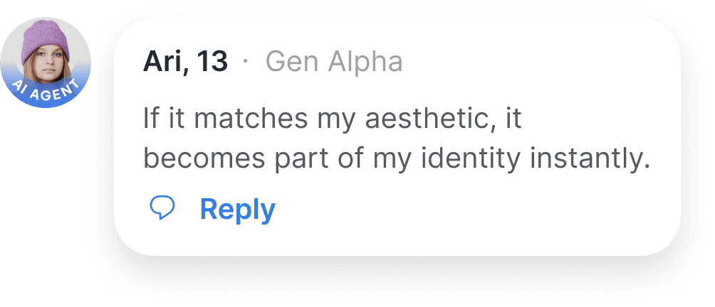 To move beyond surface-level observation, we built a synthetic focus group of 100 teen personas aged 13–19 across global trend centers — China, Japan, Thailand, the UK, and the U.S. These agents were modeled with psychographic depth, cultural fluency, and behavior patterns rooted in digital fandom, irony-driven expression, and aesthetics-as-identity.